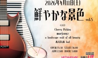 MOHANAK特別企画「鮮やかな景色」vol.5 会場:新横浜LiT出演:MADAM bad(as ADAM at) / marjongz / Cherry Picking / a landscape void …詳細を見る -